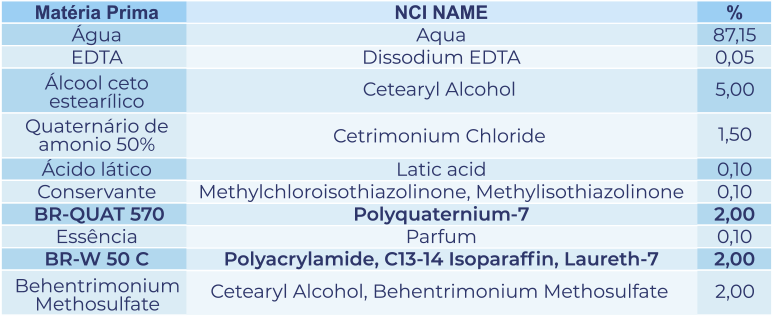 O BR-W 50 C é um polímero para ser utilizado em cremes capilares. Em dosagem de até 2% proporciona o efeito “desmaio” do cabelo e penteabilidade a úmido. Em dosagem entre 2,5 a 5% proporciona o efeito “Teia” sem a formação de Build-up. Concedo ao creme capilar um sensorial de mousse ao ser aplicado no cabelo. Melhora a performance de condicionamento e penteabilidade em fórmulas básicas e de baixo custo.