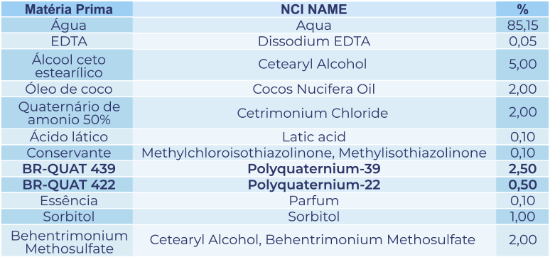 O BR-QUAT 422 é um poliquaternio com alta carga e alto teor de sólidos. Devido à sua excepcional estabilidade química, é ideal para uso em formulações de alto pH ou altamente oxidativas, tais como descolorantes, tinturas, relaxantes e permanentes capilares na função de formador de filme e ação condicionadora.